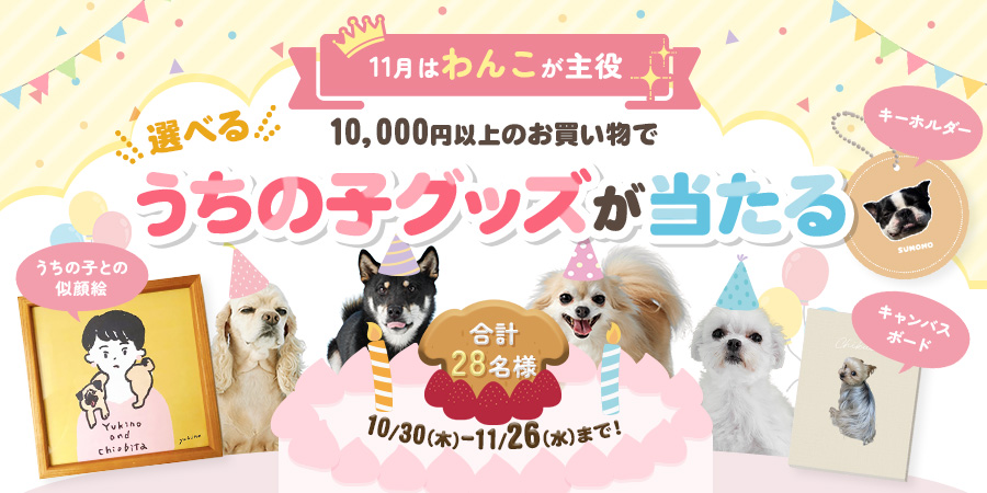 【11月はわんこが主役★】1万円以上のお買い物で、うちの子オリジナルグッズが当たる!