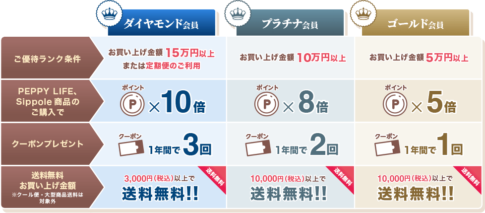 ※定期便ご利用のダイヤモンド会員様が、定期便を解約された場合、解約日の翌日から、前年のお買い上げ金額に準じた特典となります。