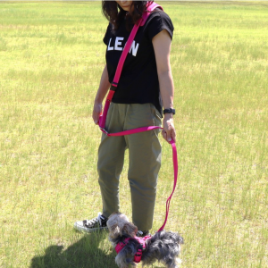 脱走防止に、首輪とハーネスの両方につなげられるWナスカンリード。