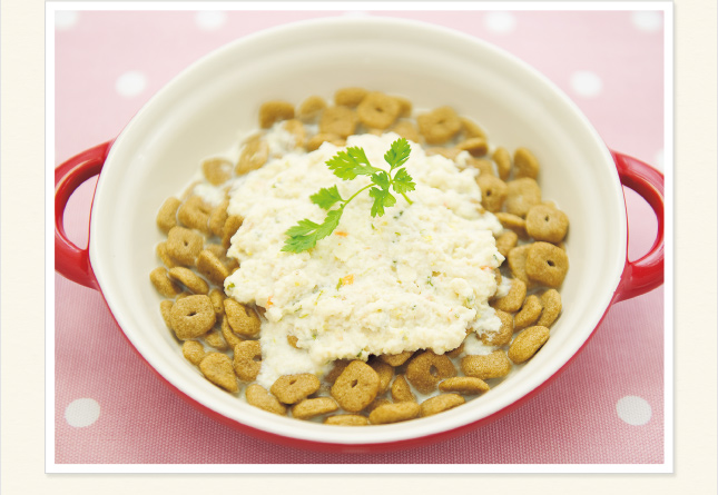 1. (1)ベストフリーズドライフード“ササミリゾット”をフードの 上に乗せる。
