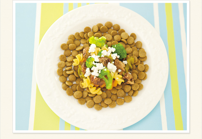 沸騰後2~3分煮込んだら、1のショートパスタとブロッコリーを加えて水分がなくなるまで煮込む。 - (3)器にドライフードを入れ、2とカッテージチーズを盛り付ける。