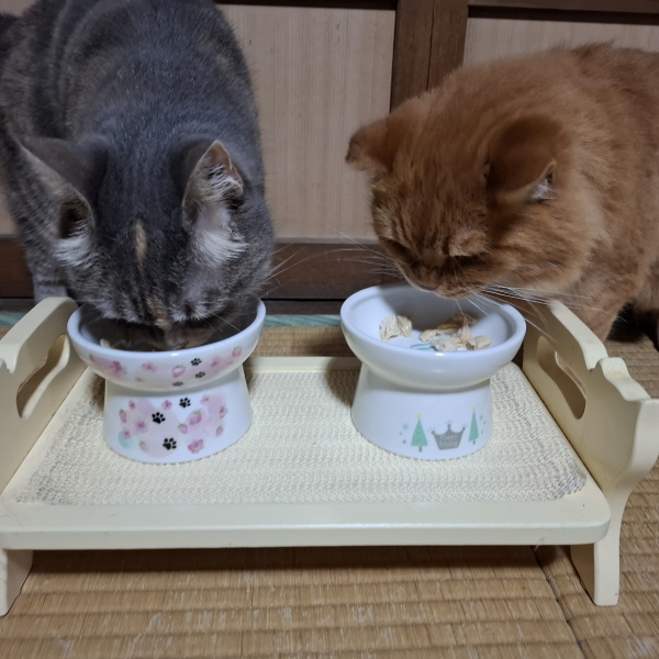 そのままだと食べにくいようで、細かくして食べさせてました。二匹ともすぐ完食しました。