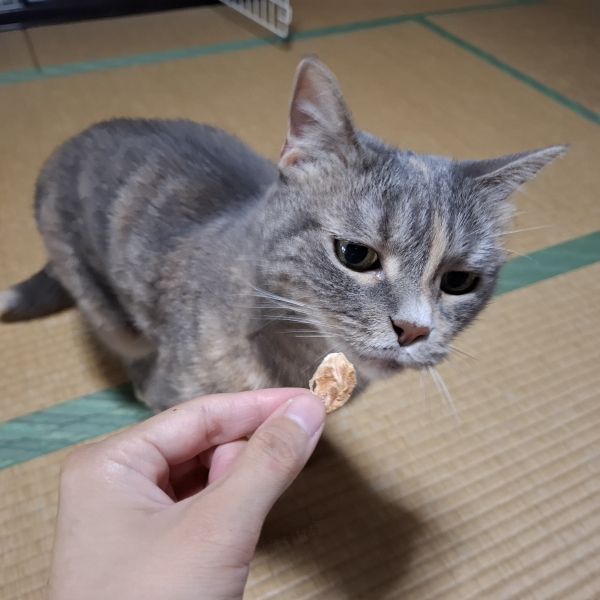 かなり硬いので、少しちぎってからあげました 食いつきもよく、国産なので安心してあげることができました