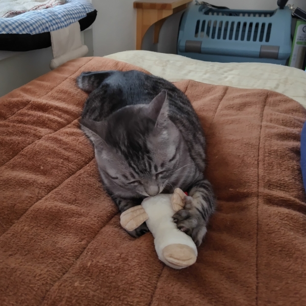 リピートです。しっぽと鼻先を噛むのが大好きです。これを与えなかったら他に噛むものがなく私の足を噛んでくるのでこれがないと駄目です。猫の口の大きさに合い噛み心地も良いのだと思います。こたつの中に引きずり...