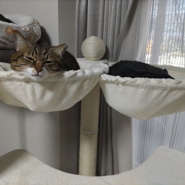 ここが一番居心地がいいみたいです。帰宅すると2匹で寝ています。バロンは8kgなので、大きなハンモックがとても気に入っているようです。購入してよかったと心から思います。