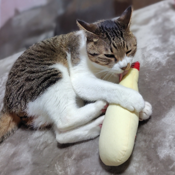 またたび効果は絶大で、口の部分をべろべろなめ回した後、文字通り激しく「キック」し始めました。大きさも手頃なのがナイスです。