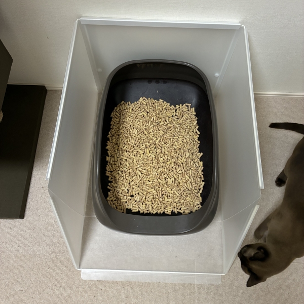 トイレ砂の飛び散りがガードされ、床にでる砂が少なくなりました。お掃除するのも楽です。