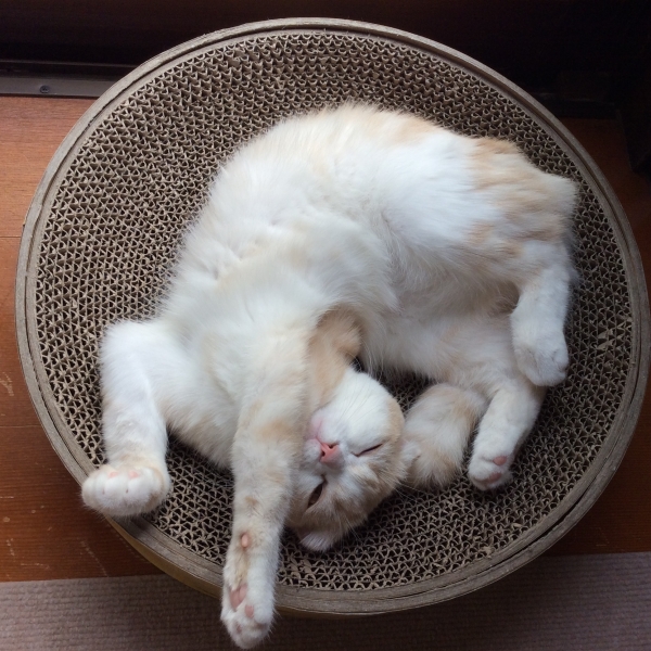 5ヶ月使用してさすがに交換。爪もとぎますが、お昼寝でも愛用してます。丸くなって寝るのにちょうど良いみたい。アンモニャイト。12歳。6キロ。