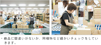 通常の検品作業は、カタログ発行前に担当者4名で手分けして倉庫で行っています。どれだけ検品しても不備などが見つかり、お客様には大変ご迷惑をおかけしています。100%を目指してチェックを行います!!