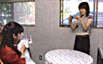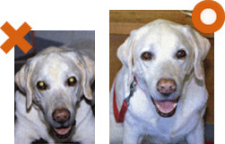 暗いところを見て動向が開いた所にストロボの光が入ると、目が光ってしまいます(×)。カメラに付いている赤目緩和機能(暗いところで瞳を自然に撮る機能)を使えば防げます(○)。