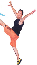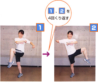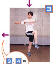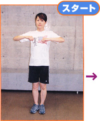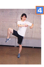 お腹を引っ込める近道は、腹筋を鍛えること。でもお腹だけをスッキリさせても、体のバランスを考えると不自然です。上半身に下半身と反対方向のひねりを加えることで、全身運動になり、かつ腹筋に効果的です。慣れてきたら軽く跳ねるようにエアロビクス感覚で。
