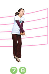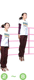 手を下ろした自然な形で膝を閉めて軽く胸を張り、その場で軽く8回ジャンプ