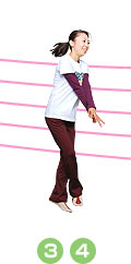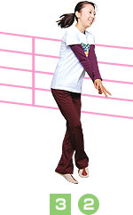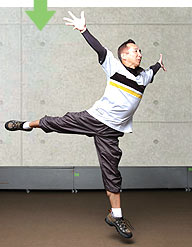 片脚で小さくジャンプしながらもう片方の脚をつま先まで伸ばしてリズムに合わせて上下する