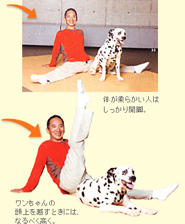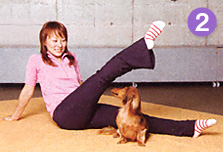 床に座って両脚を開き、片脚ずつ交差してウエストをねじります。広げた脚の間におすわりさせたワンちゃんの頭上を、触れないように超えていけるとひきしめ効果もアップ。