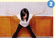 足を投げ出して床に座り、両腕を肩幅に広げて後方に付ける。このとき手の指先は前向きで。 |