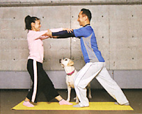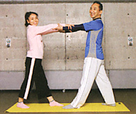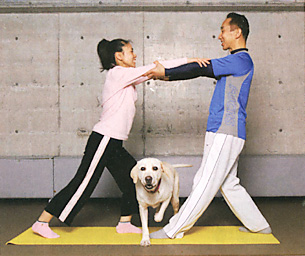 2人が向かい合ってお互いの両腕をつかみ、体重移動に合わせて脚を前後に屈伸します。体と腕をまっすぐに伸ばしきれいな平行四辺形になるよう意識しましょう。