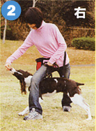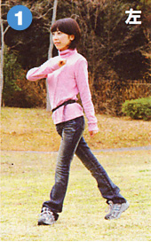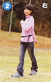 左足を一歩前へ。そのとき右足の前に交差するように置く。かかとは地面に着けたままです。 |