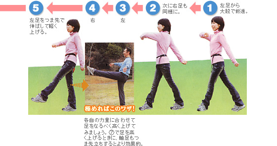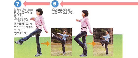 軽やかにリズムを取りながら、片足の上げ下ろしを組み入れたウォーキング。太ももの前と後ろの筋肉に効きます。ラインダンスを思わせる動きは、胸を張って背筋を伸ばし、軸脚がぶれないようにするときれいです。手はバランスをとりやすいよう、自然に上げましょう。