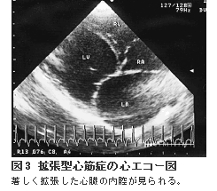 拡張型心筋症は原因不明の心筋の異常によって心臓の収縮する力が弱まり、血液を充分に送り出せなくなってしまう病気です。心臓の内腔は風船のように拡張して見えます。(※図3参照)ドーベルマン、ボクサー、グレートデン、ゴールデンレトリーバー、ラブラドールレトリーバー等の大型犬の雄に多くみられ、雄では雌の2倍以上の発病率が認められています。