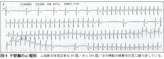 胸に耳を当てて心臓の音を聞いてみると、リズムが不規則でバラバラであったり、飼い主さんの心拍数と比べて半分位しかない、あるいは2~3倍以上もあると感じられたら不整脈の可能性が疑われます。(※図4参照)