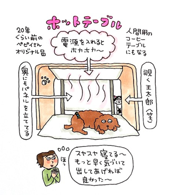 明け方が冷えるので、もっと暖かくして寝かせてあげたいと悩んでいたら、天啓のようにハッと思い出した。20年近く前にペピイカタログの連載のために送っていただいた電気ホットテーブル!深夜に納戸からガタガタ運びだし、電源オン。即あったか〜。ダイダイもスヤスヤ。もっと早く思い出すべきだった。