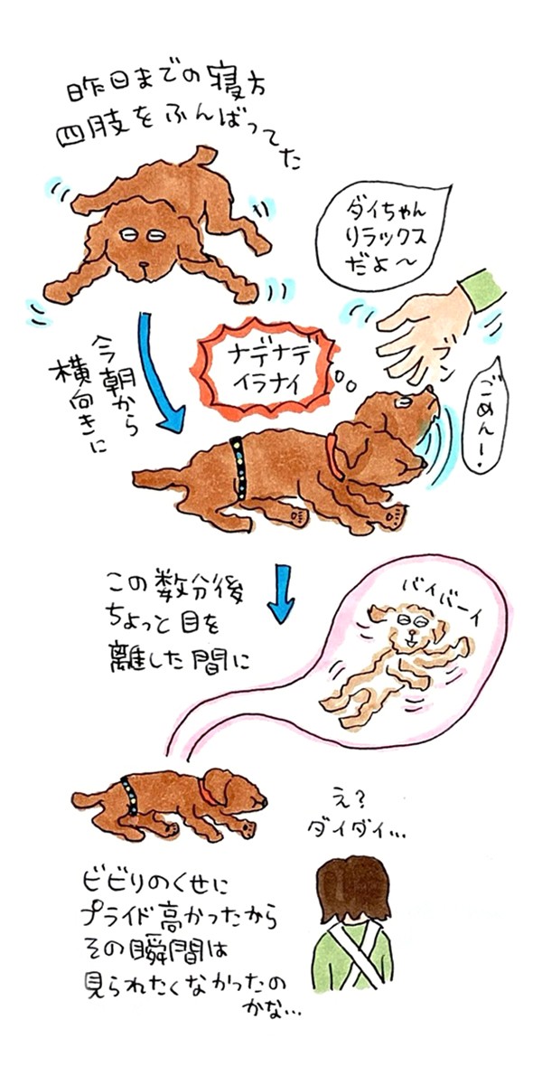 最期の日までの心がけを獣医さんからアドバイスされる。それは「ダイダイちゃんには悲しい顔を見せないこと」。涙をこらえながら帰宅。
