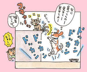 | 前回はバニラとゲッペイがお互いのトイレを気にしてばかりいるお話でしたが、トイレだけじゃなく、2匹はお互いのゴハンも気になって仕方ありません。2匹ともキッチンでゴハンを食べますが、食事スペースは別々。ゲッペイは調理台の上、バニラは床の上です。バニラは自分のドッグフードをソッコー平らげると、まだ食事中のゲッペイを覗き見るため、調理台の前でドッカン!ドッカン!と必死の垂直ジャンプを繰り返します。それを尻尾で阻止し、フガ~ッ!と威嚇するゲッペイ。もう、騒々しいコトこのうえナシ! あげくに、お互いの食べこぼしを競い合うように味見したりなんかして…。朝晩2回、そんなお下品な食事風景が恒例となって久しいカンザワ家であります。(しつけが悪くてお恥ずかスィ~) |