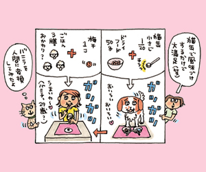 もちろん基本的には、ゲッペイは猫用、バニラは犬用フードだけを食べています。が、季節の変わり目などに食欲が落ちたときには、お互いのゴハンが前向きに役立ちます。特にバニラ。食べ残したドライフードに猫缶をチラッと混ぜてあげるだけで、がぜん食欲復活!ガツガツと平らげてくれます。その様子を人間に例えるなら、「梅干し1コでご飯3膳イケる粗食の人」みたいな感じ。