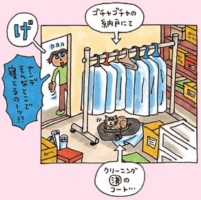 ハンガーラックから引きずりおろしたコートの上(クリーニング済み!…泣) ヒトから押しつけられるコトが苦手なとこは、血液型B型っぽい?(って、猫にB型ってあるの??)