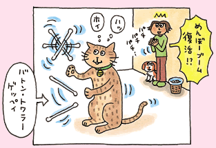 そんな気まぐれ屋のゲッペイにも、長年飽きずにお気に入りなアイテムがあります。それはなんと「綿棒」。カンザワがゴミ箱に捨てた使用済み綿棒を、器用に拾いだしては前足で放り投げたり、クルクル回したり…。その様子はまるで、猫のバトン・トワリング!? この綿棒ブーム、子猫の頃から断続的に続いていて、終わったかと思うと、突然復活したりして驚かされます。今現在、