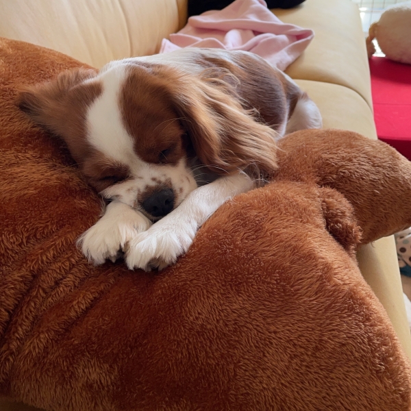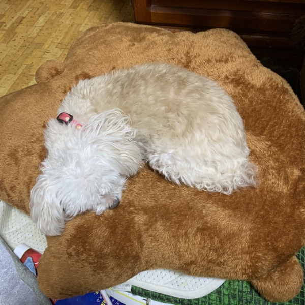 マロンちゃんはベッドが来たらすぐに寝ました。気に入ったみたいです。思ったよりボリュームがあって下手らず弾力があって長持ちしそうです。気持ち良さそうです。