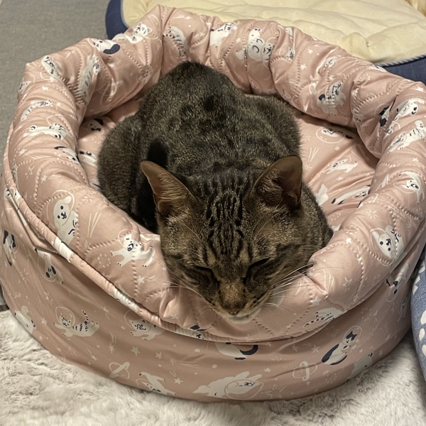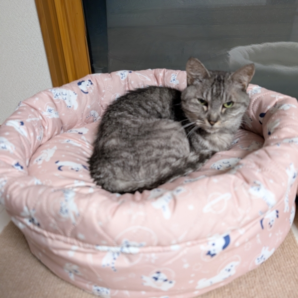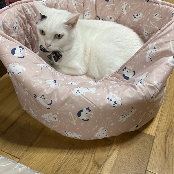 最初は少し警戒してましたが、届いたその日に使ってくれました!ほりほりしてベッドの中で毛繕いし、そのまま寝てました。内側がキルトっぽい感じですが、糸を使ったキルトでは無いのでほりほりしても爪が引っかかり...