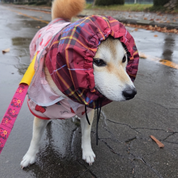 耳が隠れるので嫌がるかなぁと思っていたのですが、全くそんなことはなくちゃんと付けたままお散歩してくれます。頭に雨が当たらなくてすごく良いです!