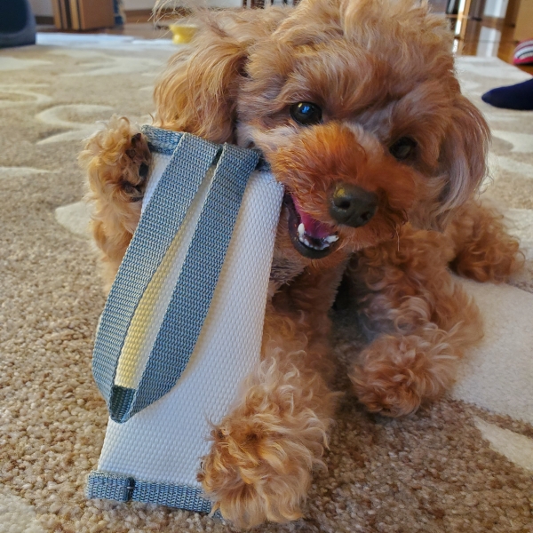 今までぬいぐるみ、噛むおもちゃを買って来ました。その日に噛んで壊してしまったり、すぐちぎって誤飲しそうになり、心配ばかりでしたが、このおもちゃは、すごく噛むこと嬉しいみたいで、渡すと喜んで噛みまくって...