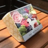 ●主材:プリザーブドフラワー(バラ、カーネーション、あじさい、かすみ草)、天然石・紅水晶、 花器・陶器、シルエット・アクリル