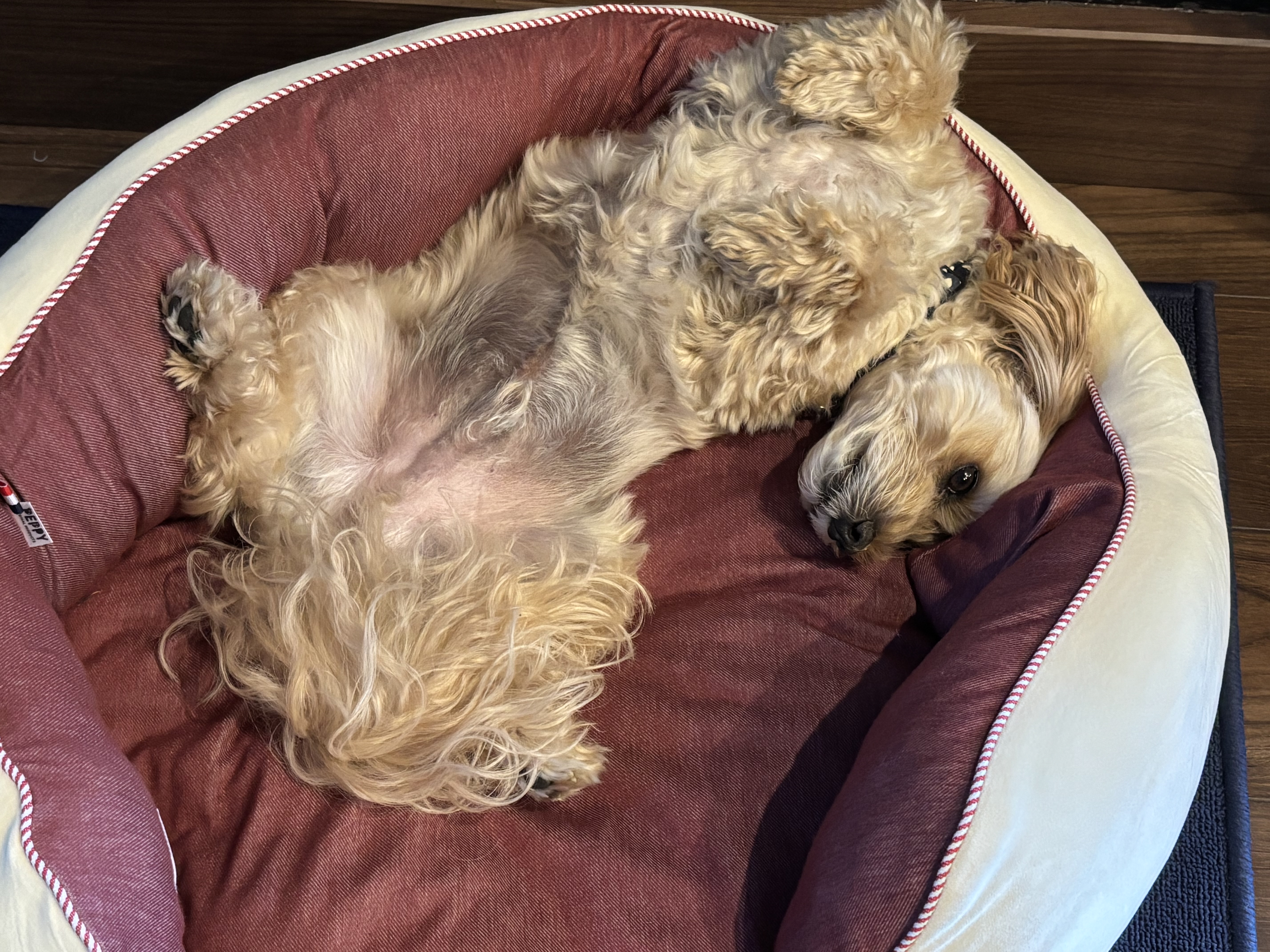 ずっと気になっていたベッドでしたが、今回、『一の市』で購入させて頂きました。Mサイズを購入しましたが、8キロの愛犬にピッタリサイズです。想像以上に心地良い肌触り!毎晩のおやすみタイム以外にも、お昼寝タイム、食後のリラックスタイム…いつも気持ち良さそうに丸くなってくつろいでいます。