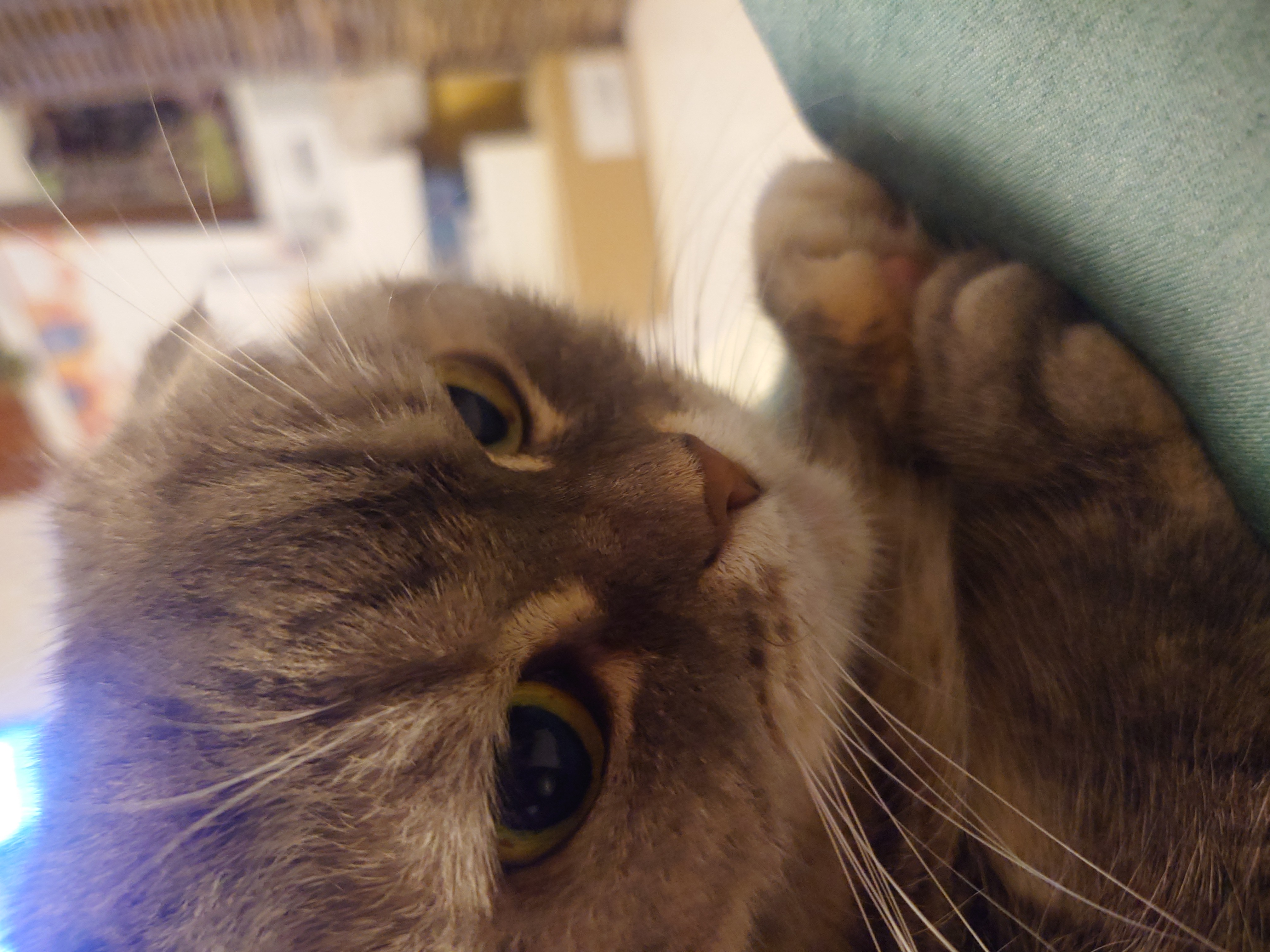 思っていたよりも小さめでしたが、体重4キロのスコにはちょうど良いサイズだったようです。よく爪研ぎの上で寝ているので、もう少し寝心地の良いものと思いましたが、確かにゴロン猫の爪研ぎの大きい方の高さを高くした感じで、馴染みやすい大きさかも。椅子や床に置いても違和感がなく邪魔にもならない感じなので、猫たちが気に入ってくれれは、数を増やしても良さそうです。