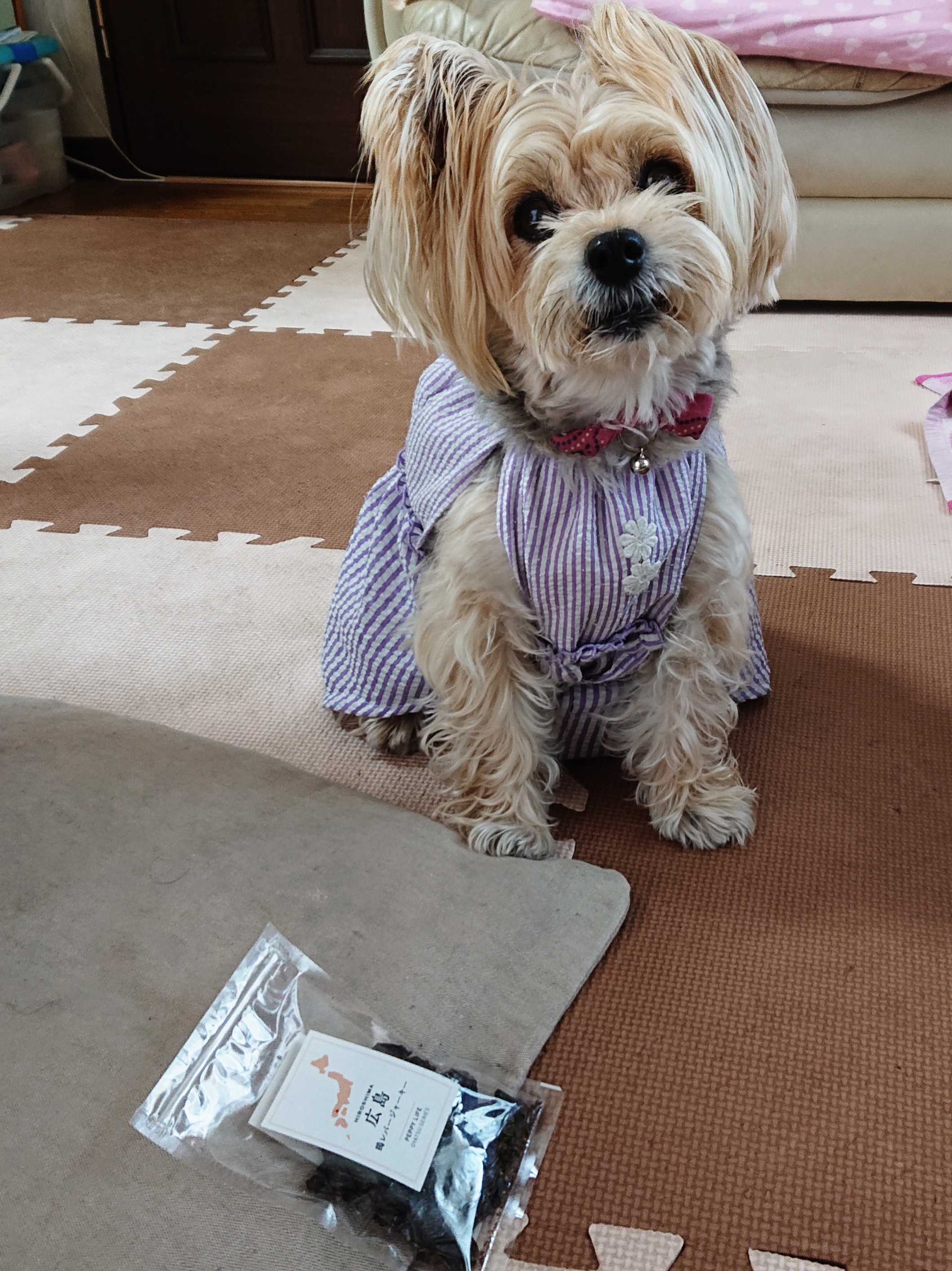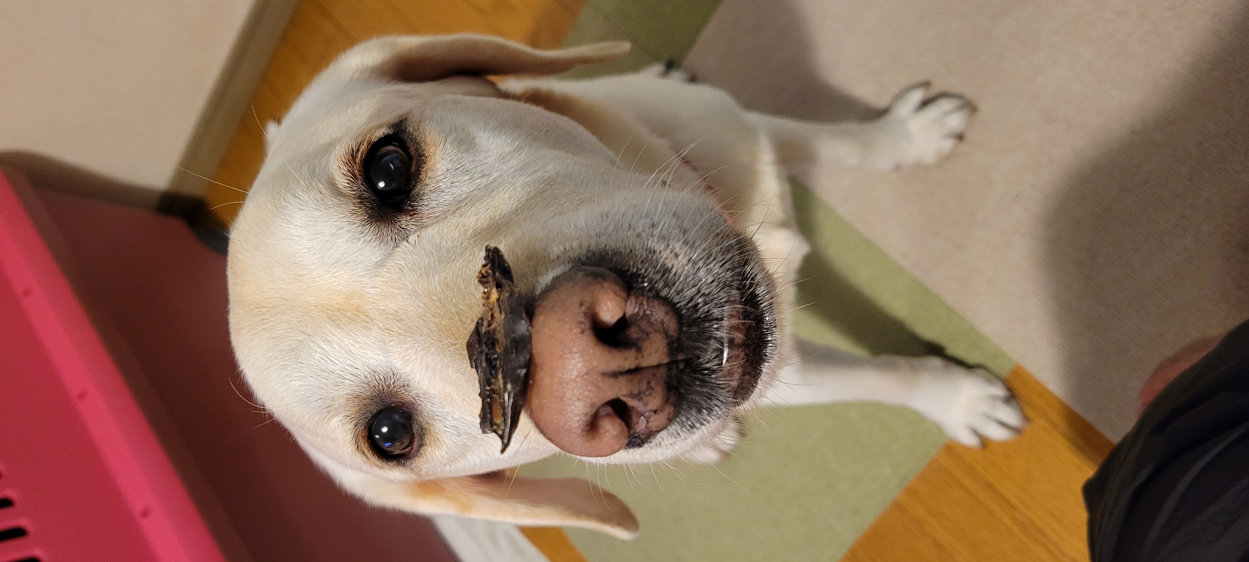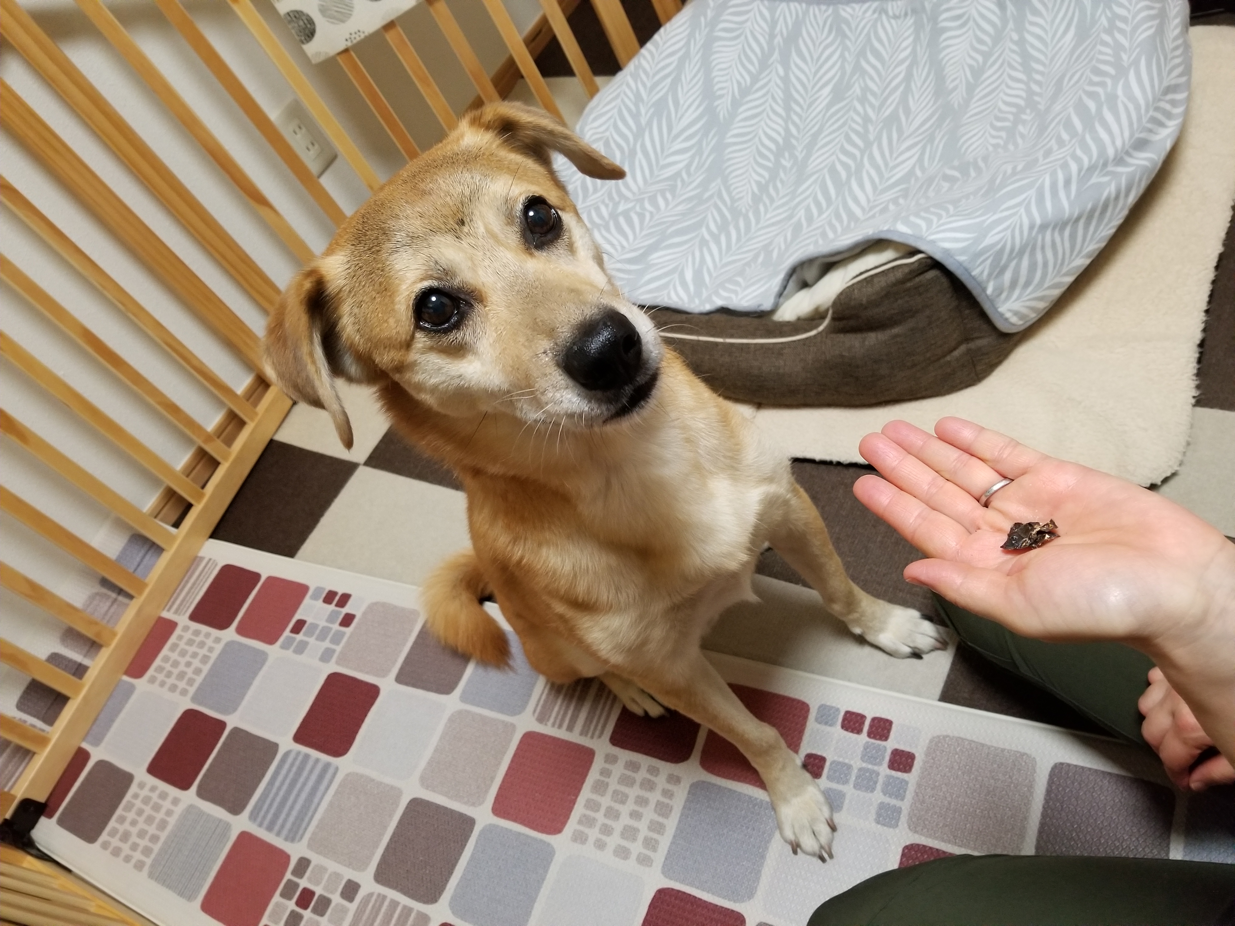 袋を持っておいでと呼んだら、何やら既に興奮気味でやって来てソワソワと(同居犬が入って来られない台所にて) 1回目は小さく割らないでそのままサイズを、その後、おやつの時間に数枚ずつ何日かに分けて、最後の方では小さくなったのをドライフードに細かく香り付けとしてトッピングしました。 バクバクたべました。良い香りだと思います。 追記 ワクワクするけど、待ての体勢のジェミちゃんです!※モニター商品ご利用のご感想です