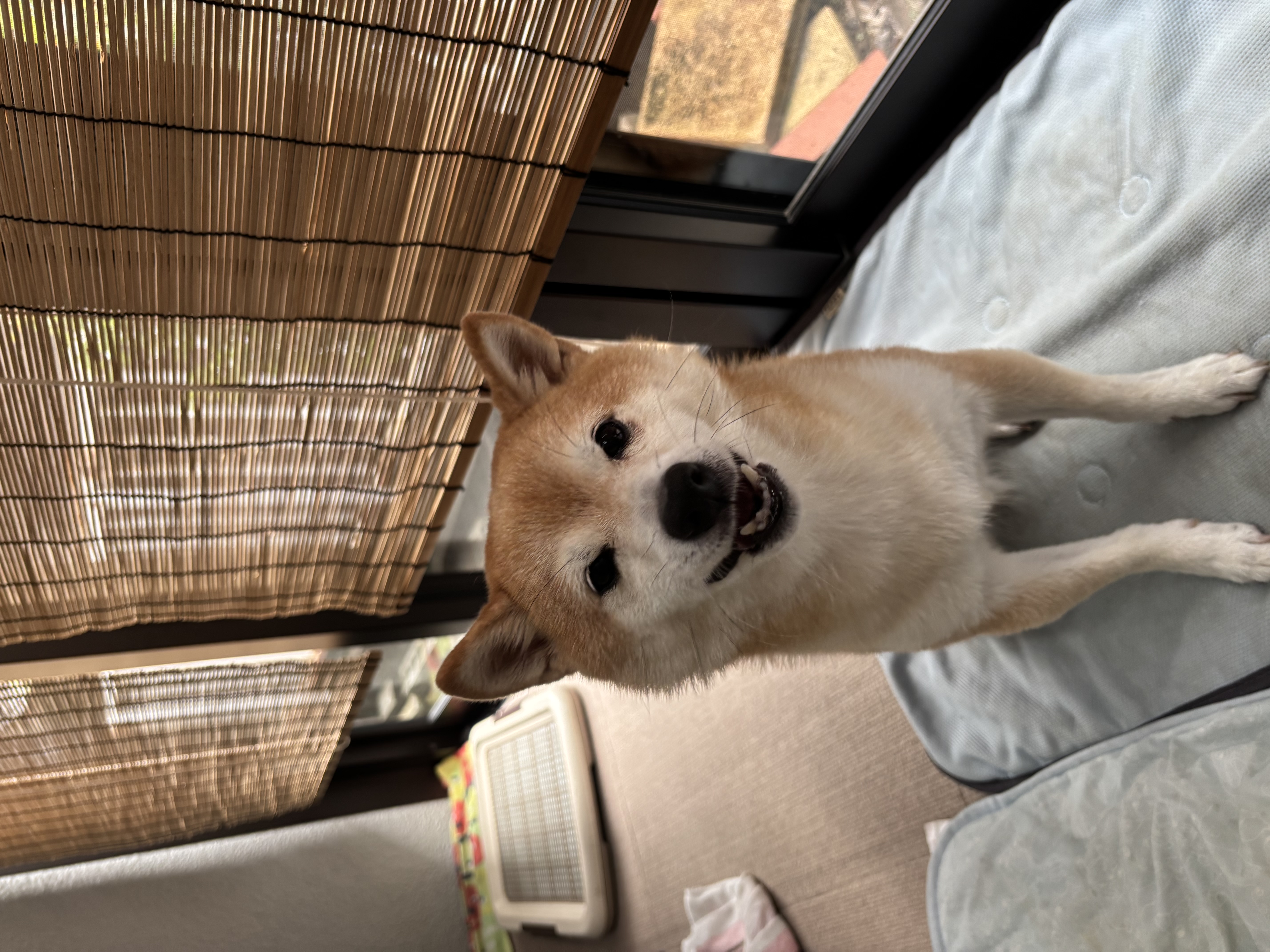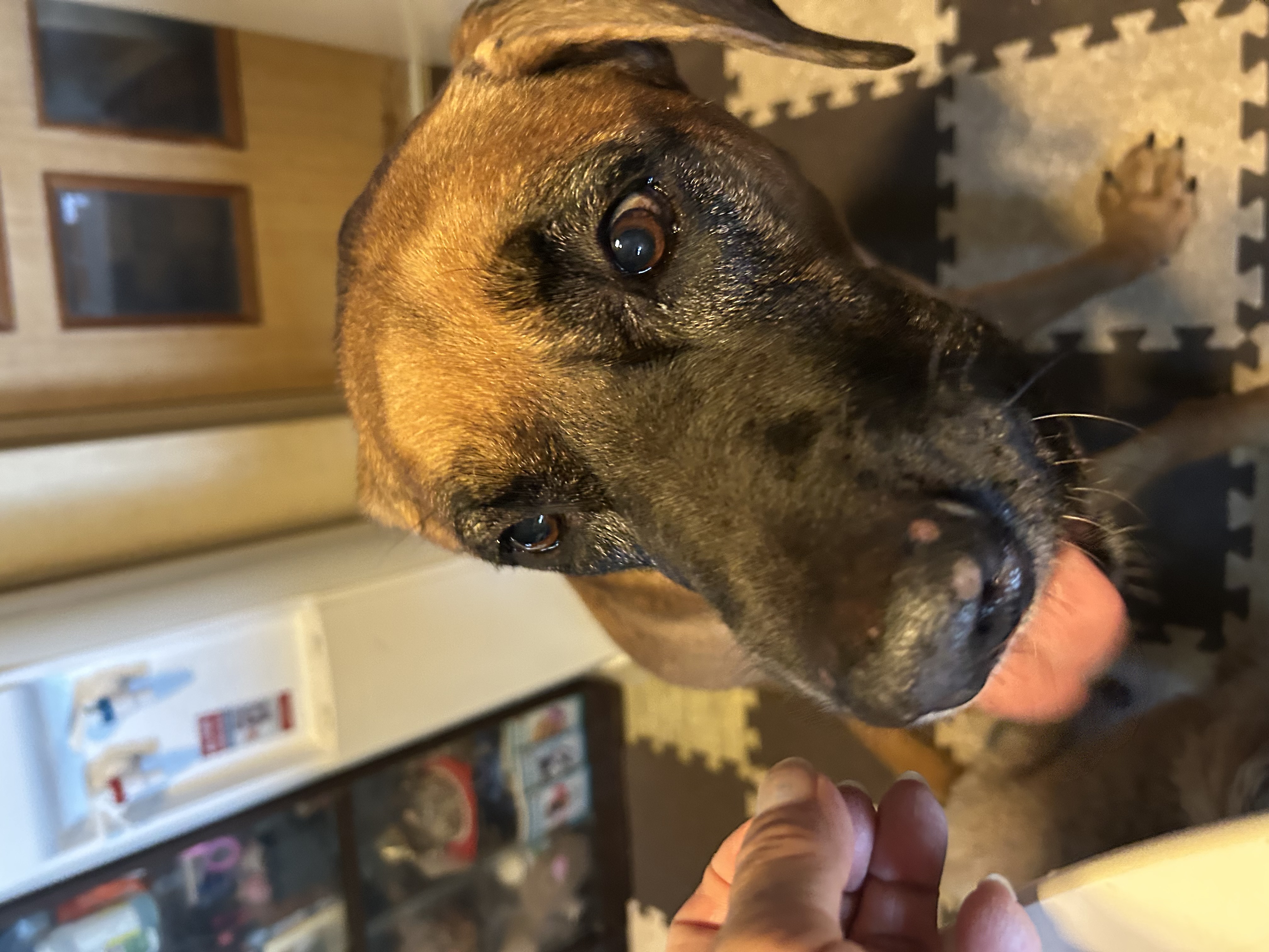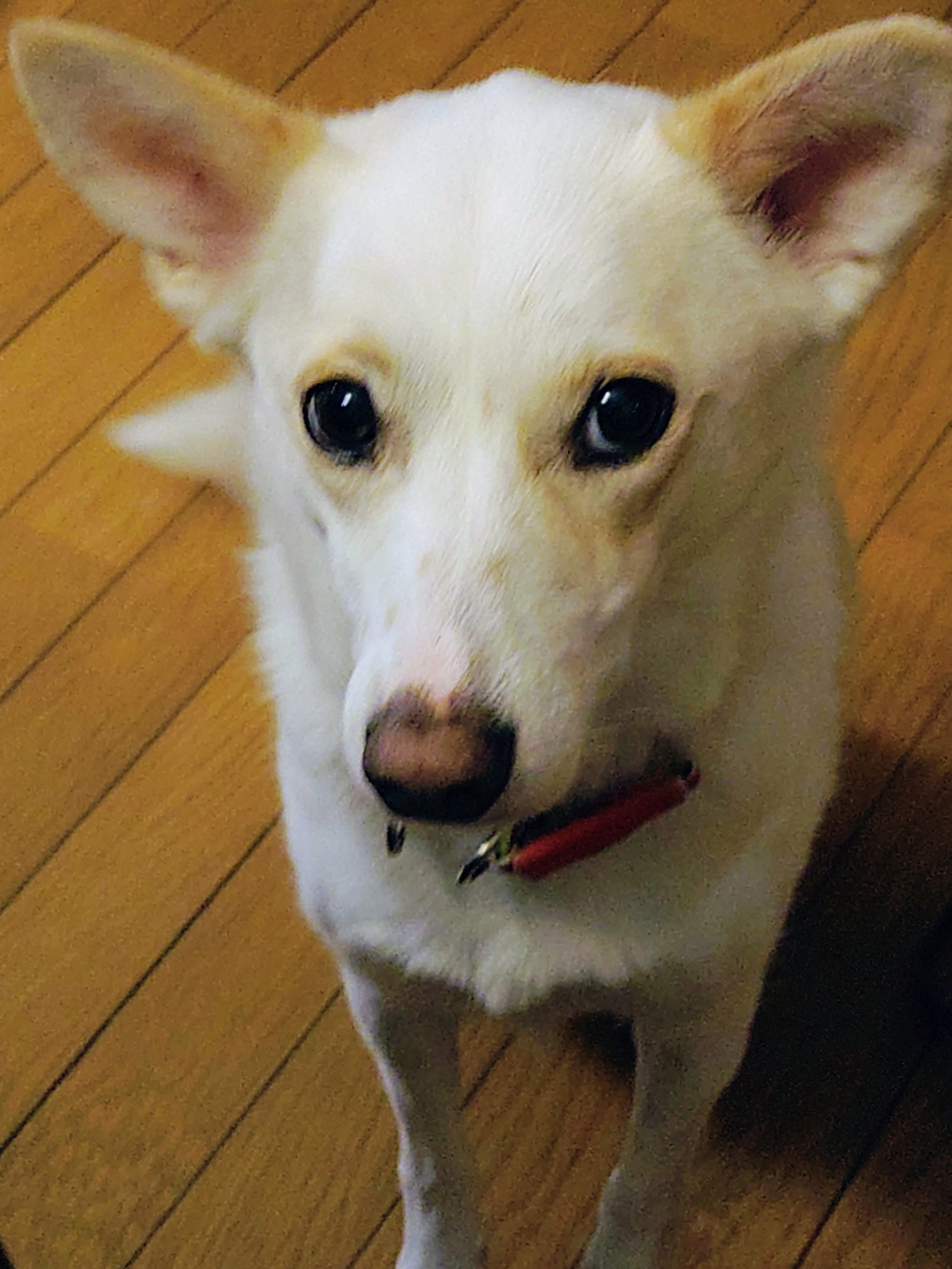 袋を持っておいでと呼んだら、何やら既に興奮気味でやって来てソワソワと(同居犬が入って来られない台所にて) 1回目は小さく割らないでそのままサイズを、その後、おやつの時間に数枚ずつ何日かに分けて、最後の方では小さくなったのをドライフードに細かく香り付けとしてトッピングしました。 バクバクたべました。良い香りだと思います。 追記 ワクワクするけど、待ての体勢のジェミちゃんです!※モニター商品ご利用のご感想です