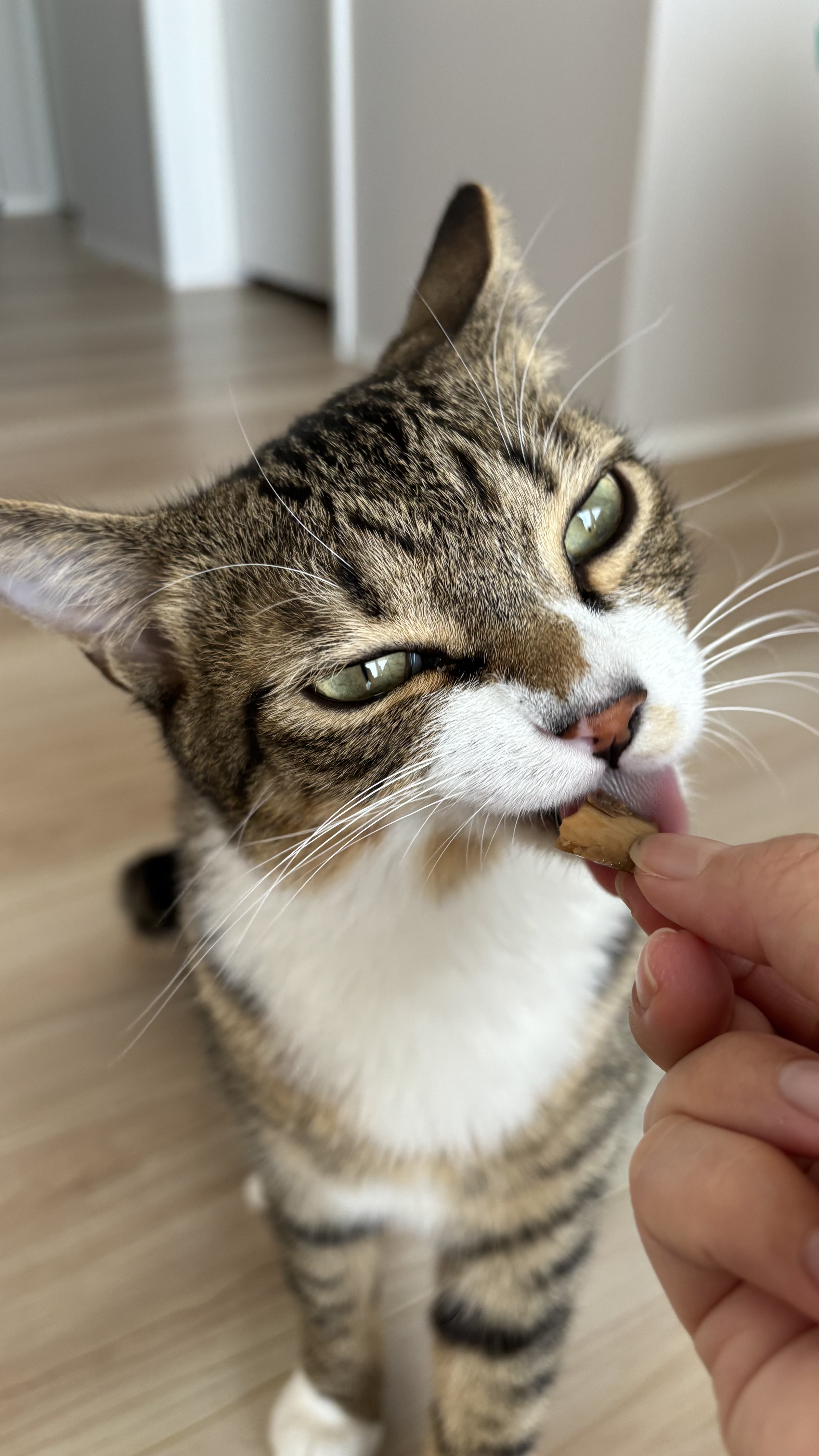 かつおのいい匂いがします! 手でほぐしてあげやすいです。 魚好きな子はもちろん、最初は警戒していたチキン派の子も食べてくれました。 おやつにも、ほぐしてご飯のトッピングにもあげやすいです。※モニター商品ご利用のご感想です