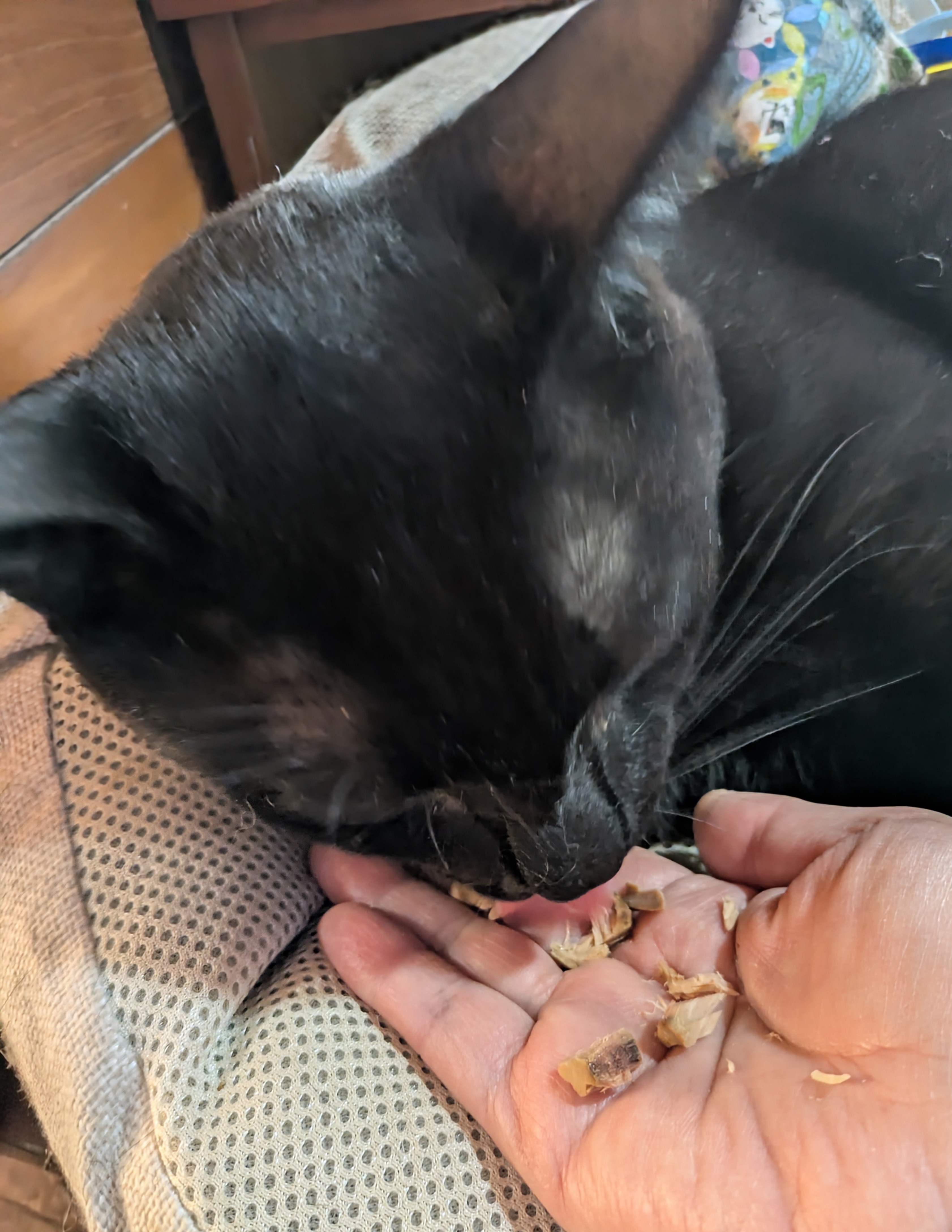 この子が魚味を好みます。実はお昼寝中でしたが、袋から出した美味しいうちに食べさせたいと、お顔の前に持っていきました。香りに誘われ、すぐに目を開けて寝ていたのがウソのようにたくさん食べてくれました。かつおの香りがしっかりします。特にお魚味を好むネコちゃんは、たまらない香りだと思いました。 今回は5頭で1袋が無くなりました。ちょうど食べ切れる量でした。※モニター商品ご利用のご感想です