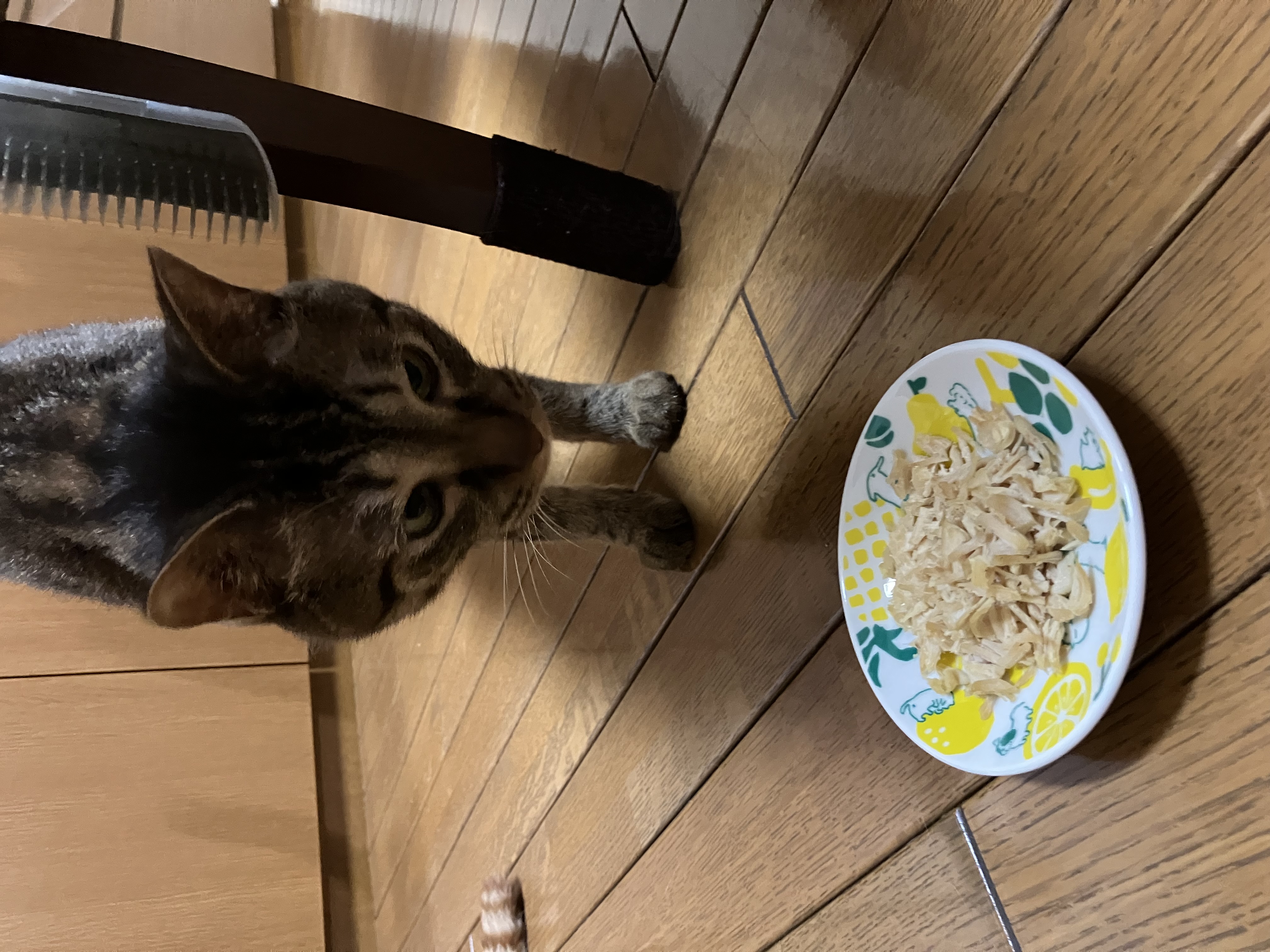 残念ながら、こちらも食べません(泣) 少しスモーキーな匂いがダメなのか、匂いを少し嗅いで離れて行きました。 ほぐし安くてジューシーなんだけど、、 ちなみに兄猫も匂いだけで離れて行きました。※モニター商品ご利用のご感想です