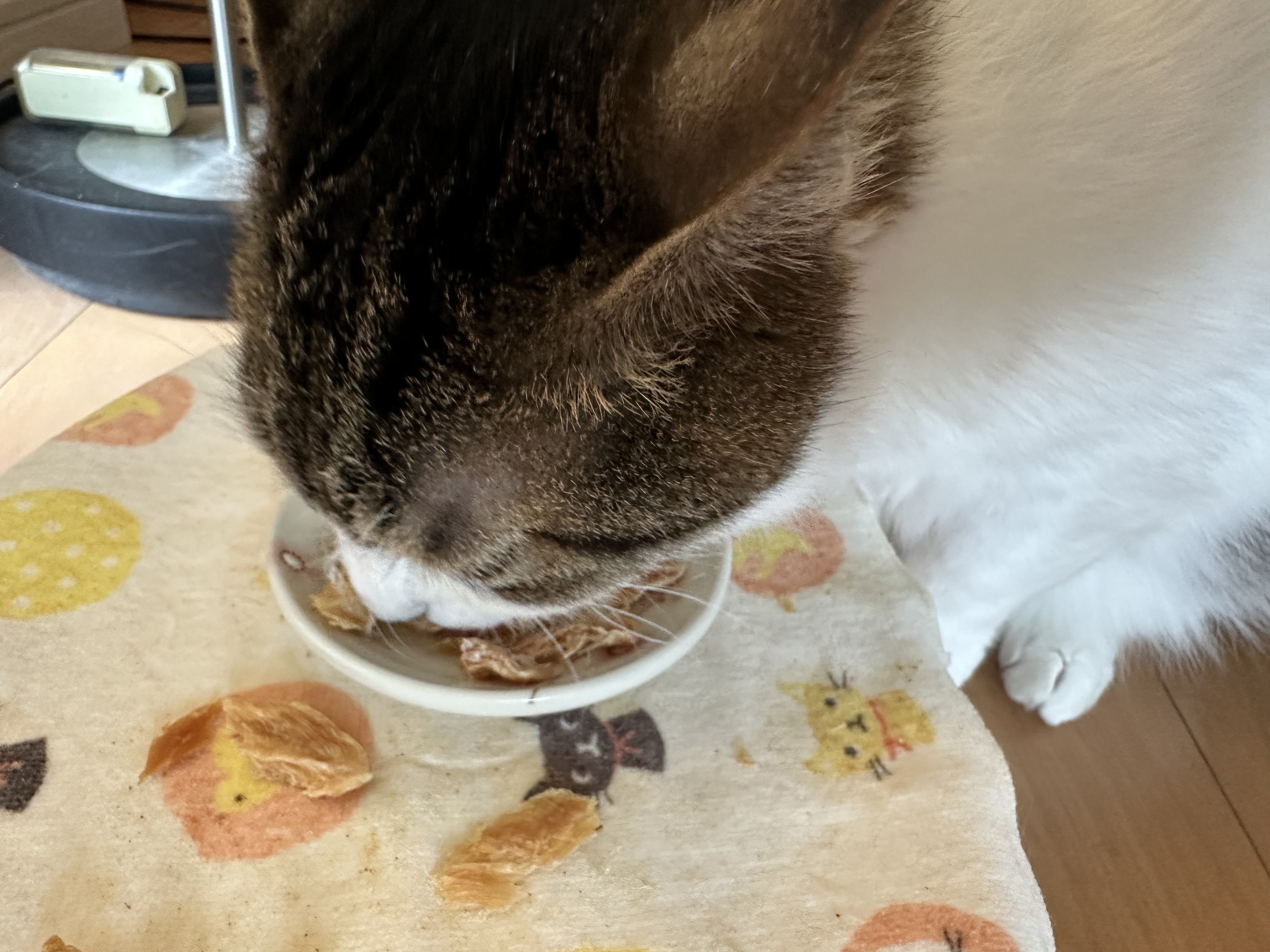 普段から硬いのがあまり好きではないので、大丈夫かなと思ったのですが、チキンは好きなので匂いを嗅いで食べようとはしました。想像通り、かたくて噛むのやめたので(苦笑)、ほぐしてあげたら食べました。完食です。味は好みだったので、しっかりおかわりを要求されました。 保存料、保湿剤などできれば使ってない素材だけのおやつを普段からあげてるので、こちらは国産だし安心です。※モニター商品ご利用のご感想です
