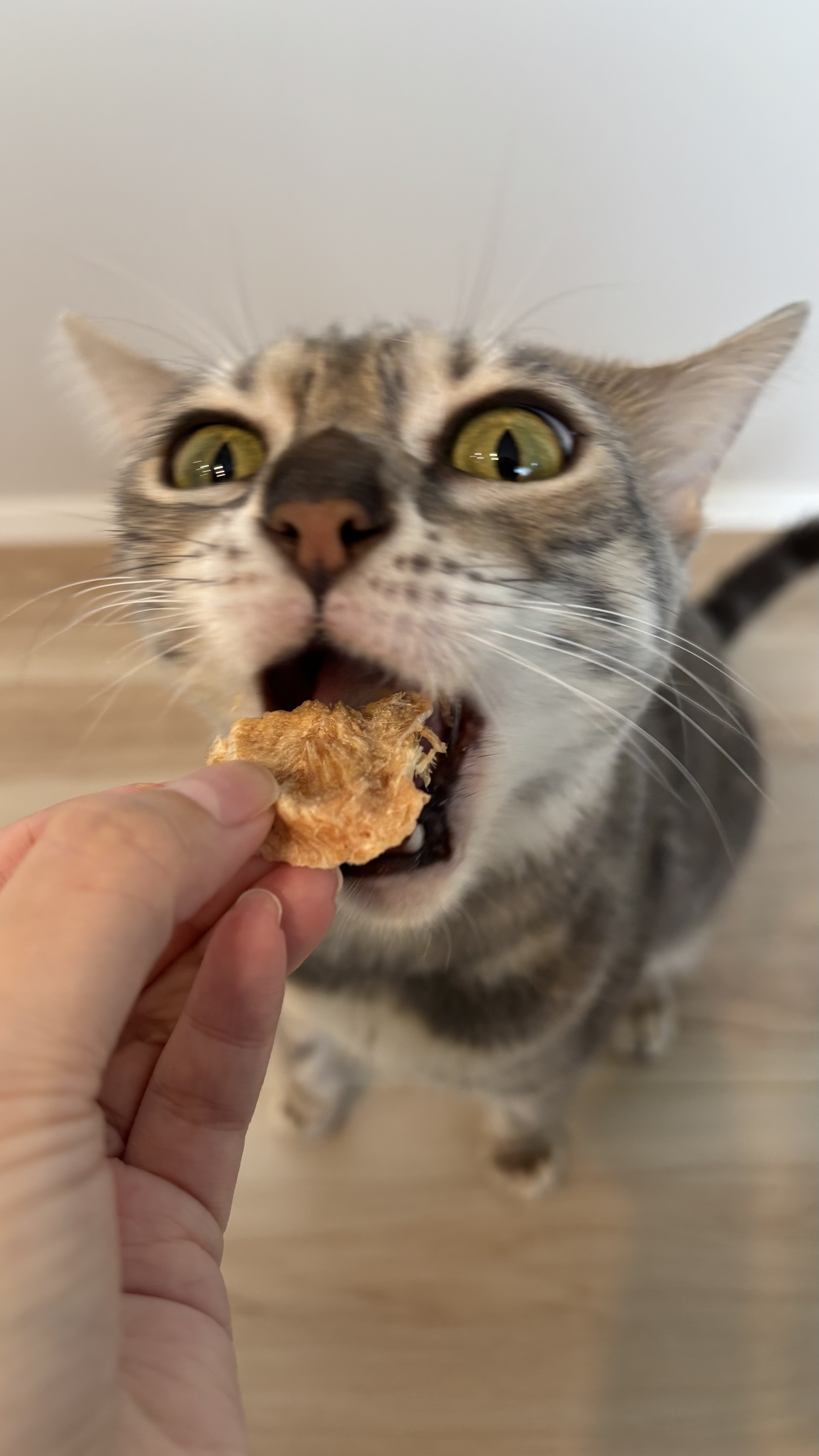 新商品モニターに当選しました。写真撮ろうとしてもブレるくらい(笑)ガツガツと食い付き抜群!準備してても「早くしろ~!」とニャーニャー大興奮でした(笑) 国産で無添加なので安心安全性があって良いです!いい香りもする、それが猫的に一番良かったのかな?少量だから開けたて新鮮なのをあげれる。ジャーキーだから硬くてほぐすとボロボロしちゃうけど、トッピングしたらカリカリの食い付きも良くなりそう! ただ、値段もちょっとお高めなのでウチの子記念日とかであげるのにいいかも?※モニター商品ご利用のご感想です
