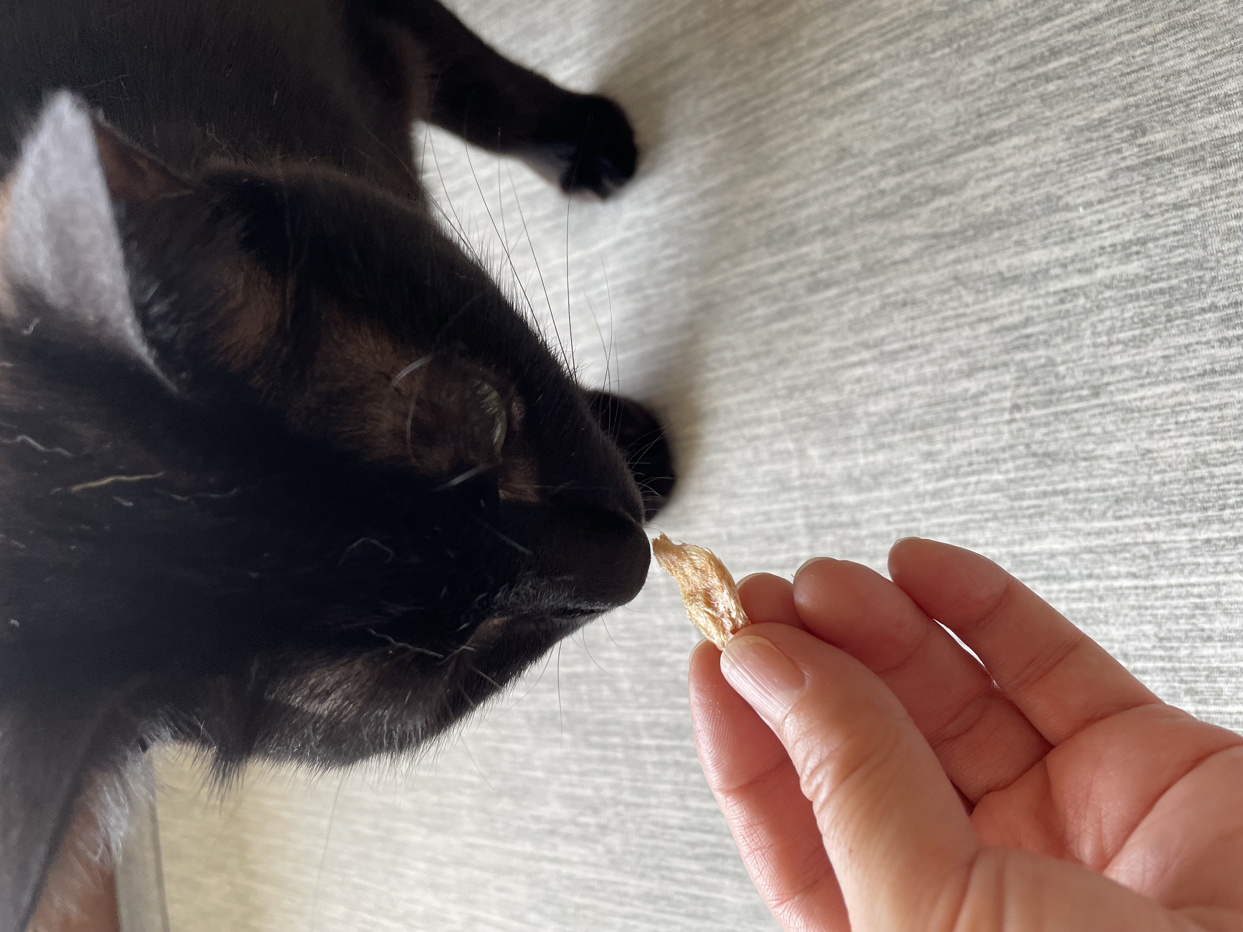 軽くて平べったいので、猫が食べづらそうにしていました。一度口に入れても咀嚼している時に口から出てしまう事も。床に落ちたものを再度食べるのが難しいようで、トッピングとして与えました。小さくちぎってフードに乗せれば上手に食べられます。単体であげる事が難しいので、ご褒美としては微妙です。 猫の食いつきはとてもよく、完食しました。※モニター商品ご利用のご感想です