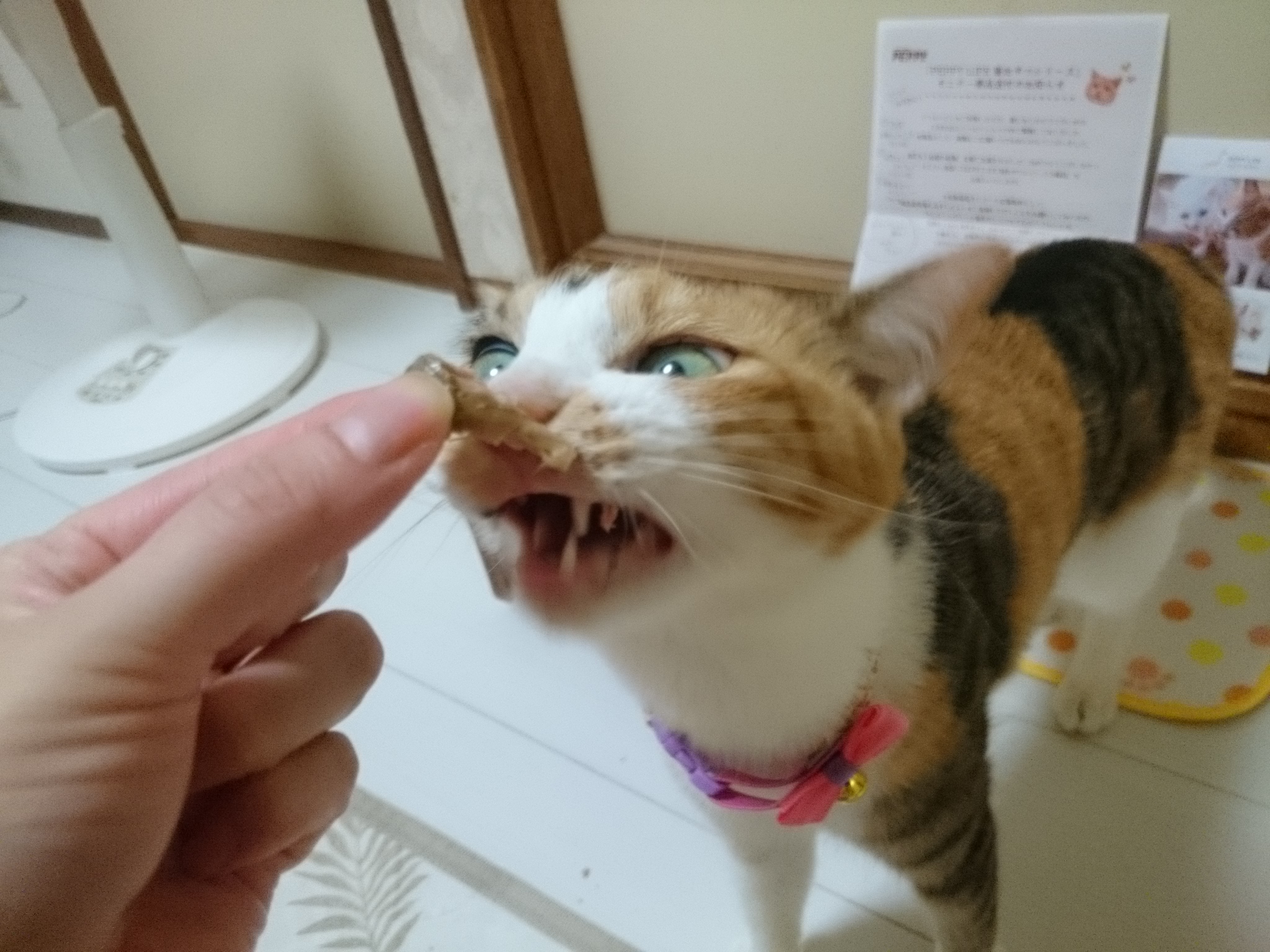 モニターお試しで割と食いつき良かったのでニャン友さんちのニャンズ用に購入。うちの子達は食べるの下手なんでかなり細かくして与えましたが、ニャン友さんちの子達は硬いのもガジガジへっちゃらみたいなので