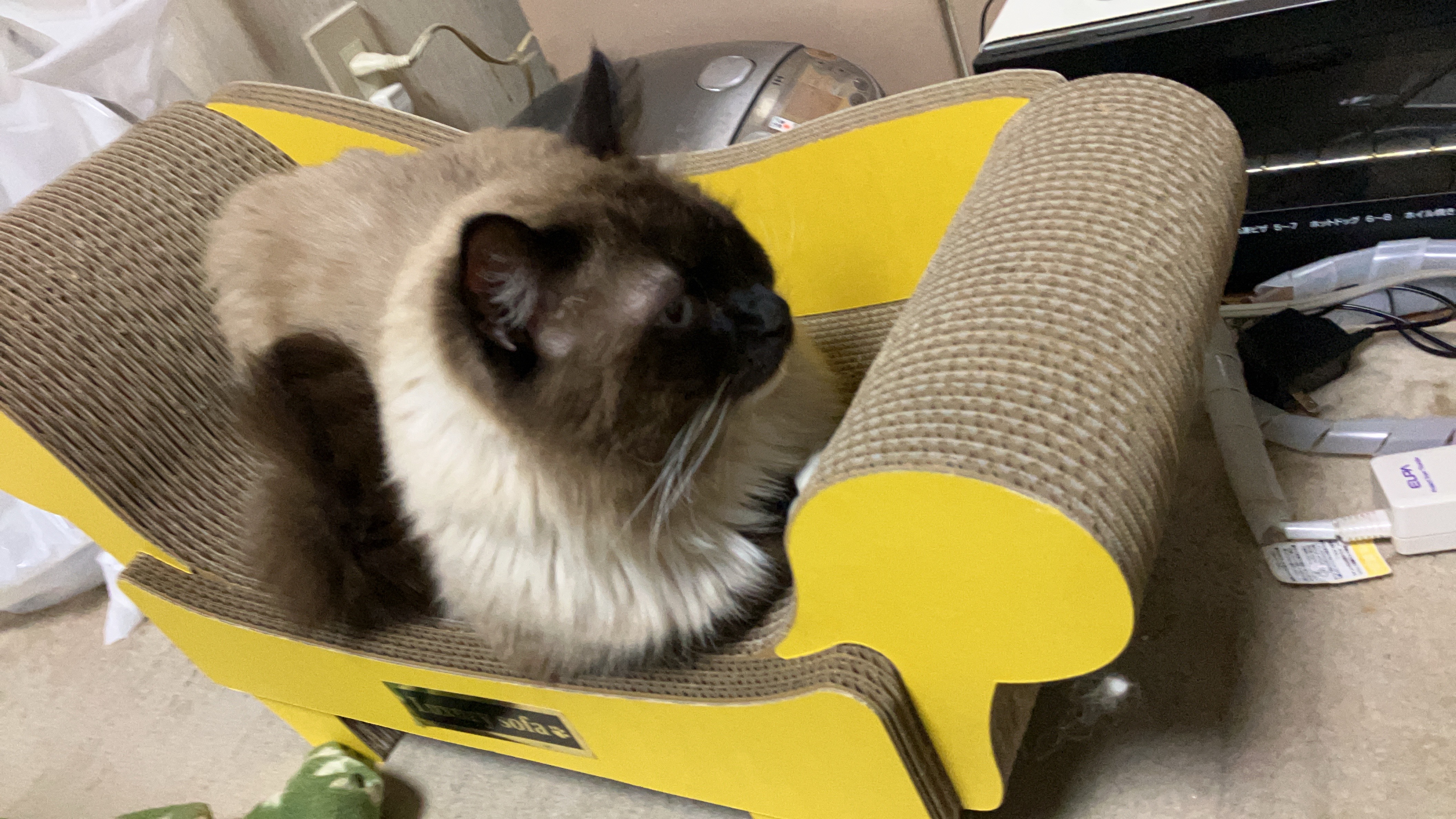 ダンボールの爪とぎが好きで、おしゃれな見た目に惹かれて購入しました。横になった姿が可愛くて気に入りました。2匹が譲り合って使っているので、幅が長いタイプのものがあったら良いなと思いました。