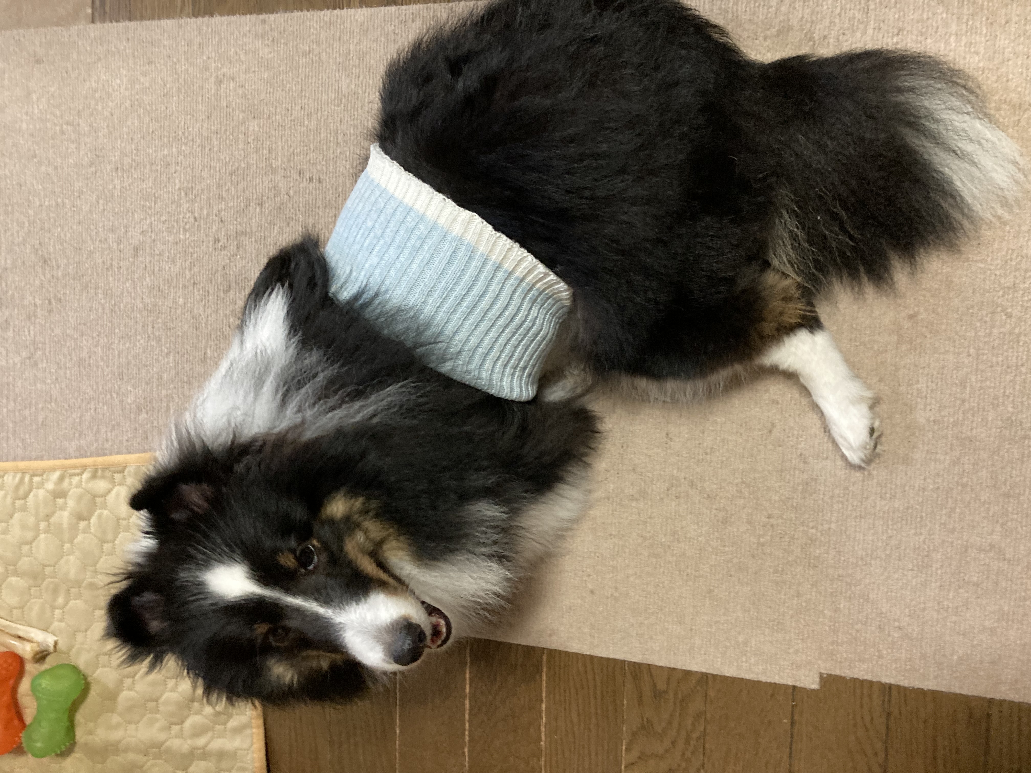 服嫌いな高齢犬で冷房や扇風機等で身体が冷えるようが意地を張って服は絶対に着無い。飼い主、腹巻きなら着るかも?と思い購入。1人が抱っこして、もう1人が犬の後ろ足から履かせる方法ならば、嫌がらずに着れた!嬉しかったです!チーの時、四つ足で用たすのですが、腹巻きにかかることもなかったです。お腹温めると全身の血流がよくなるのか、手足ポカポカになりました。