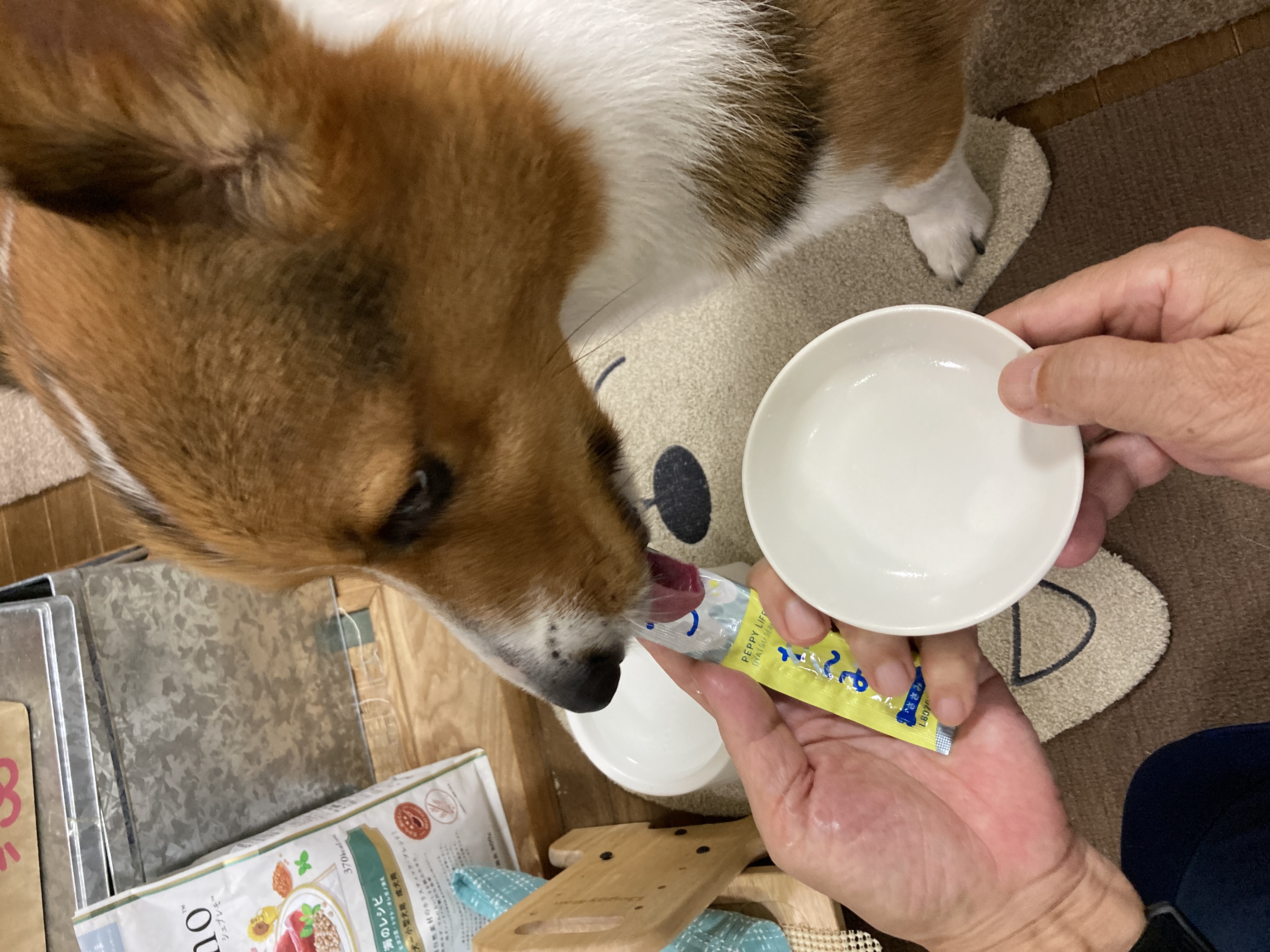 夜ごはんの食後すぐにハミガキをしますが、後ずさりしてあまりうれしそうに磨いてもらっていない日もあります。 そんな時におりこうにして終わったらわんみぃあるよって見せると最後まで協力的なワンです。真剣になめてます。