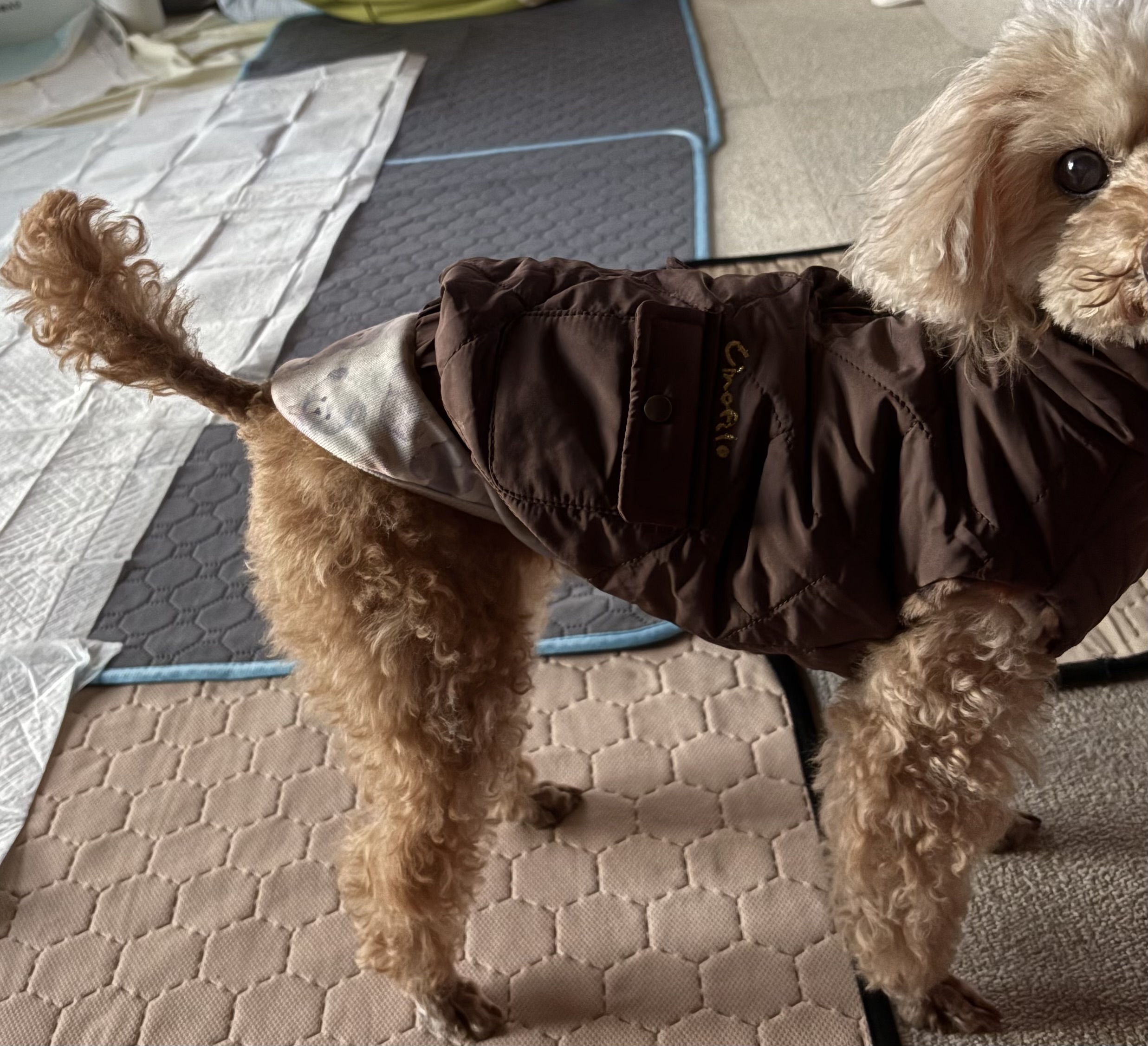 購入してから腹開きだったと思いました。やっちゃったかと思いましたが、余裕がある事と犬も足を曲げて服を着る事を覚えたので、機嫌が良ければ脱着の問題なさそうです。写真はペピィの他商品と重ねて。こうするとお尻までカバー出来る